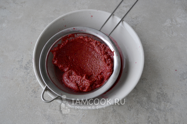 Затем малиновую массу протрите через мелкое металлическое ситечко. Косточки малиновые выбросьте.