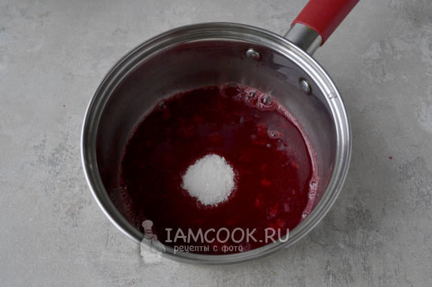 В малиновое пюре положите сахар по вкусу, размешайте и поставьте сотейник на огонь.