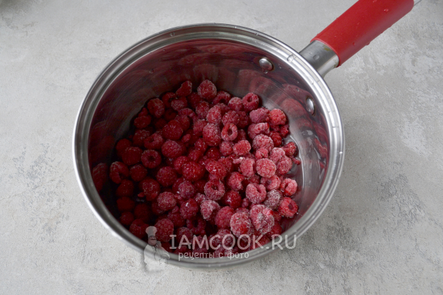 Малину положите в сотейник, влейте воду (50 мл) и поставьте на огонь.