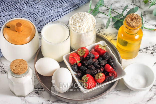 Продукты для приготовления бисквитного пирога с ягодами (замороженными) в духовке - перед вами.