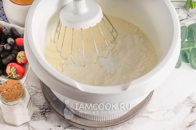 Всыпьте разрыхлитель и пшеничную муку высшего сорта по частям. Перемешайте, но не взбивайте!