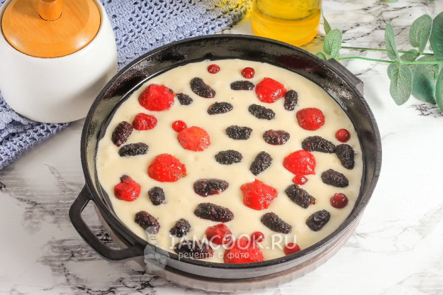 Смажьте форму растительным маслом и выложите в нее приготовленное тесто. Добавьте ягоды. Обязательно разрежьте на несколько частей крупные, а из других извлеките косточки. Я использую замороженную клубнику, вишню, шелковицу и красную смородину.