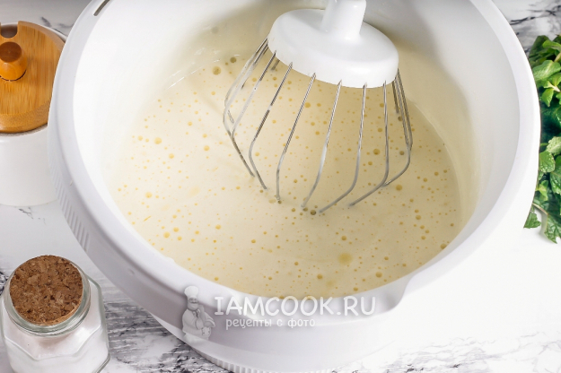 Вбейте куриные яйца в глубокую емкость и всыпьте соль, сахарный песок и ванильный сахар. Взбейте все на высокой скорости техники примерно 4 минуты, но не больше, чтобы не перевзбить всю массу.