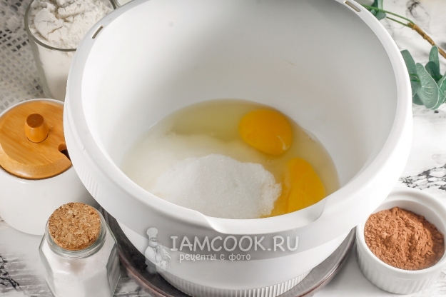 Вбейте куриные яйца по одному в чашу кухонного комбайна или в емкость для взбивания миксером. Всыпьте туда же сахарный песок и соль. Соль добавляйте обязательно - она подчеркнет вкус бисквита!