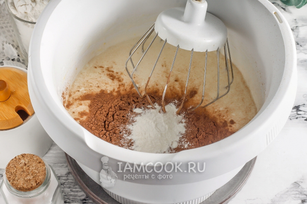 Всыпьте какао и разрыхлитель. Тщательно перемешайте все венчиком или силиконовой лопаткой, но не взбивайте, чтобы не выпустить пузырьки воздуха.