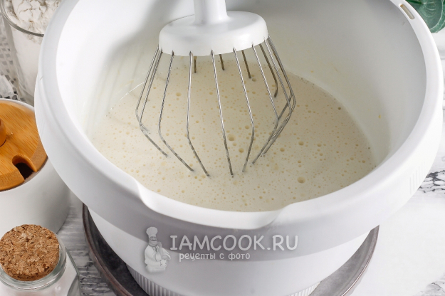 Взбейте всё в течение 4 минут. Дольше взбивать не нужно, иначе яйца можно перевзбить и они расслоятся. Влейте кефир и растительное масло без аромата.