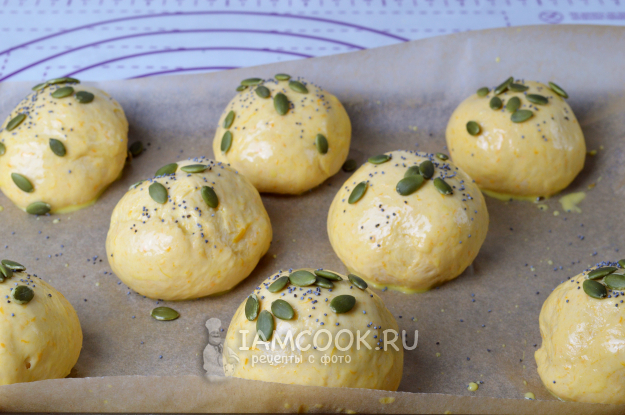 Подошедшие булочки смазать смесью яйца и молока и посыпать семенами мака и тыквы. Выпекать тыквенные булочки с чесноком в разогретой до 180°С духовке около 30 минут. Готовые булочки остудить на решетке.
