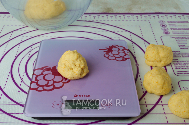 Разделить тесто на одинаковые по весу кусочки (у меня - по 50 г). Каждый кусочек подкатать в колобок и выложить на противень на расстоянии друг от друга. Накрыть пленкой и отправить на расстойку на 30-40 минут.