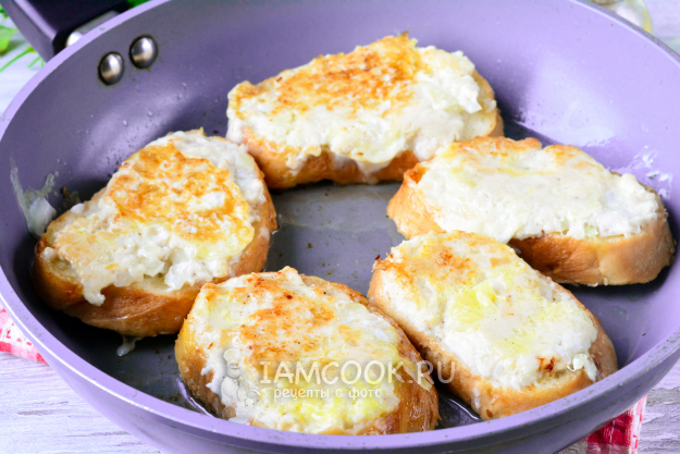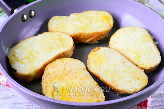Выкладывайте гренки с фаршем на разогретую сковороду фаршем вниз. Обжаривайте 4-5 минут на среднем огне. Если необходимо, долейте еще немного масла.