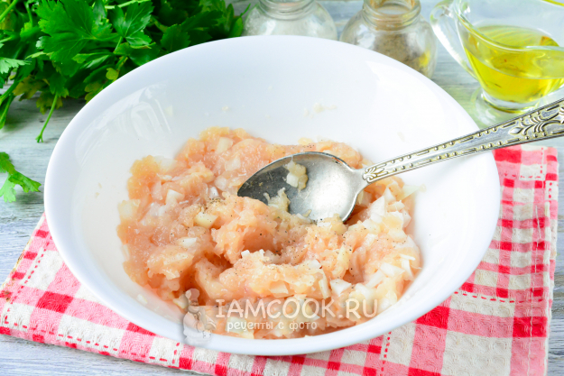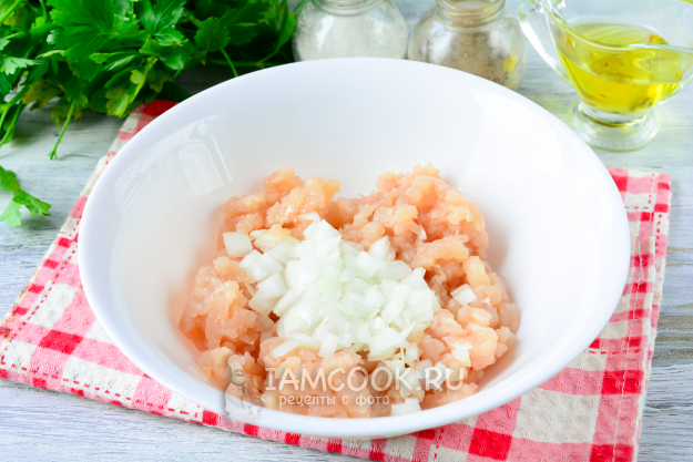 Куриный фарш смешайте с мелко нарезанным репчатым луком. Лук придаст фаршу сочность.