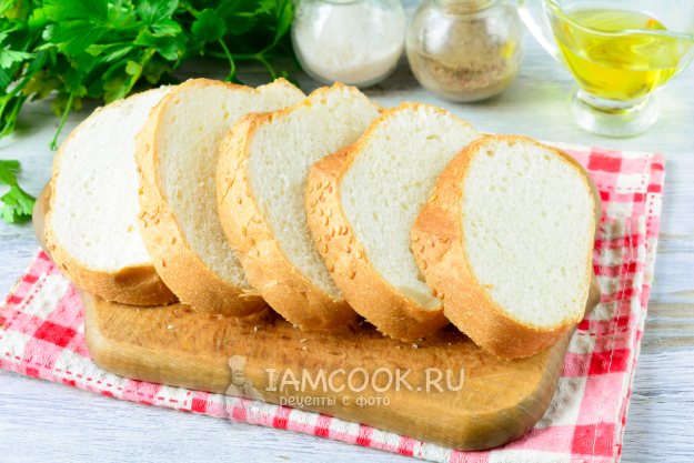 Вчерашний батон нарежьте средними по толщине ломтиками.