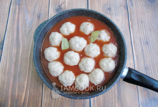 Из приготовленного фарша сформируйте тефтели и выложите в сковороду с соусом. Добавьте лавровый лист.