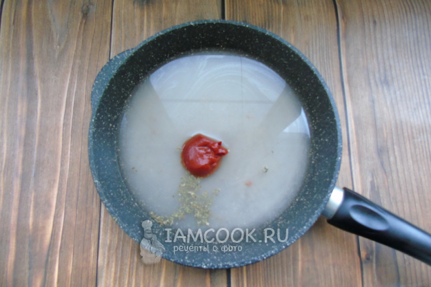 Приготовьте соус, в котором будут тушиться тефтели. В сковороду или сотейник выложите томатную пасту. Столовую ложку крахмала разведите в небольшом количестве холодной воды и добавьте в сковороду. Налейте 300-350 мл воды, добавьте соль, сахар и сушеный базилик.