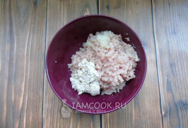 Приготовьте фарш. Лук и чеснок очистите, помойте, филе индейки помойте. Пропустите эти ингредиенты через мясорубку.