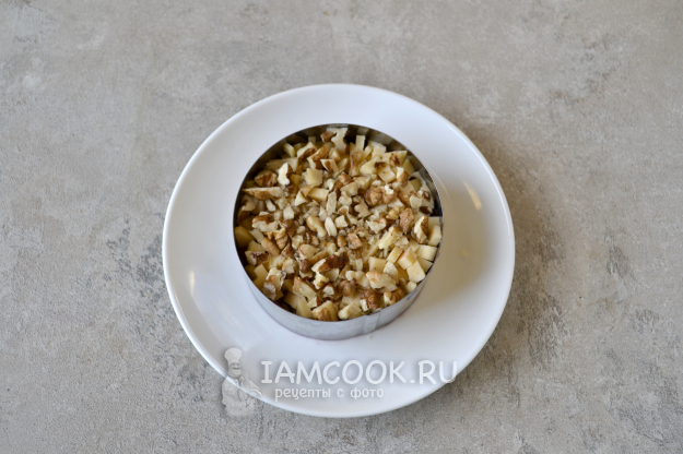На сыр положите грецкий орех. Аккуратно снимите кольцо.