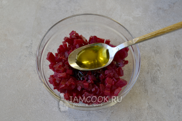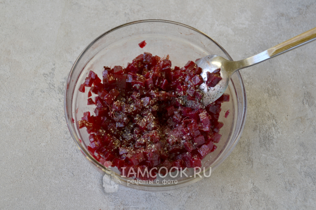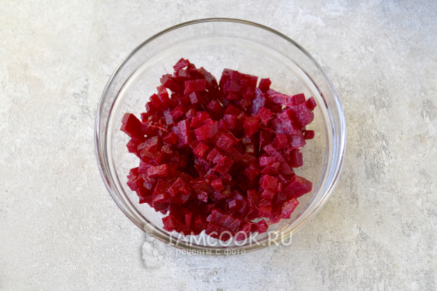 Готовую свеклу очистите и нарежьте мелким кубиком.