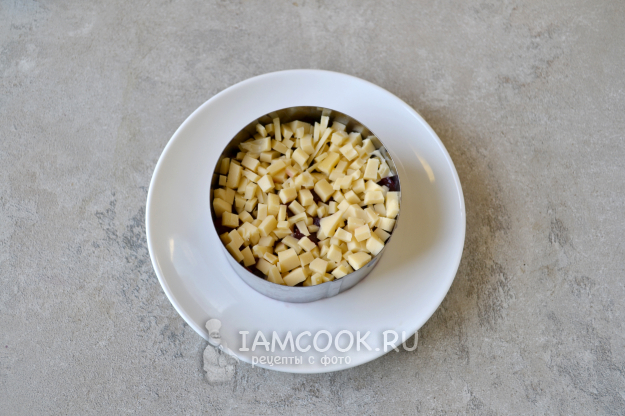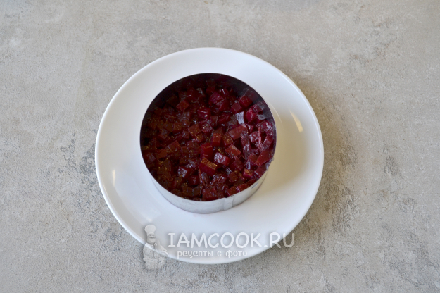 Для "сборки" тартара воспользуйтесь кулинарным кольцом. Положите в кольцо нарезанную свеклу. Ложкой свеклу уплотните.