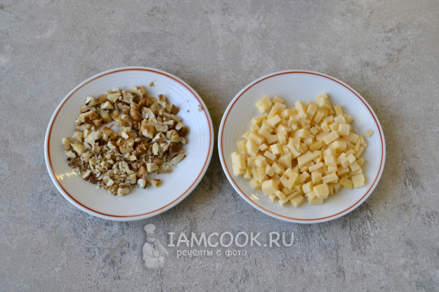 Грецкие орехи мелко порубите. Сыр нарежьте таким же мелким кубиком.