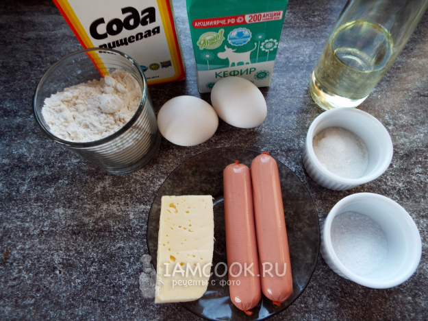 Ингредиенты для приготовления оладий с сосисками и сыром на кефире - перед вами. Для самих оладушек мы используем классический набор продуктов, добавим только парочку сосисок и кусочек сыра.