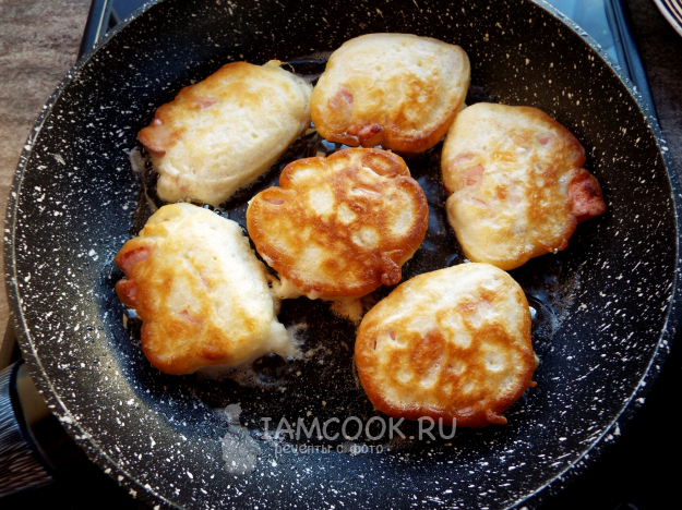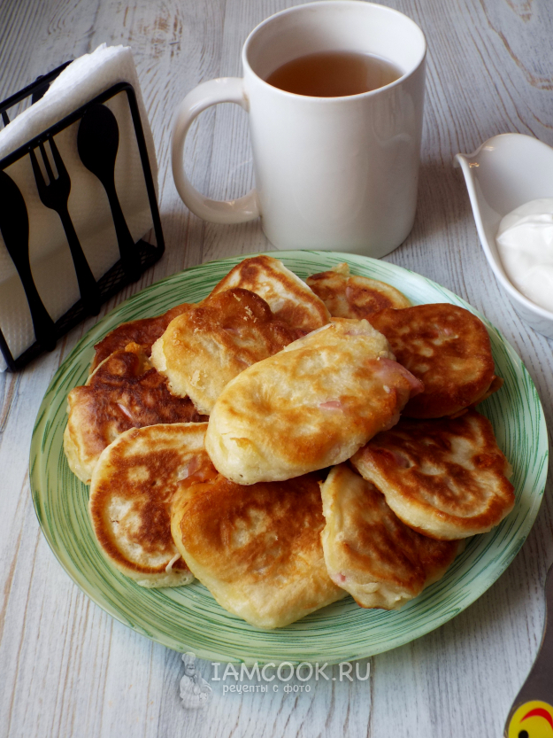 Оладьи с сосисками и сыром на кефире вкусны со сметаной.