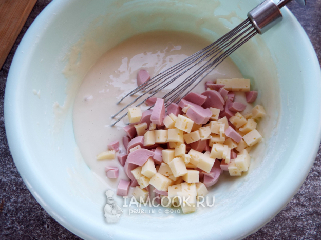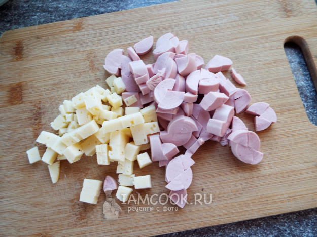 Пока тесто "отдыхает", нарезать кубиками сосиски и сыр.