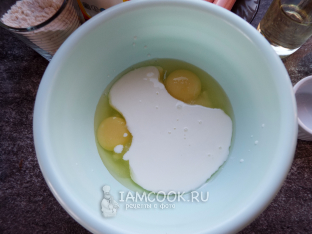 Кефир, яйца, соль и сахар соединить в миске.