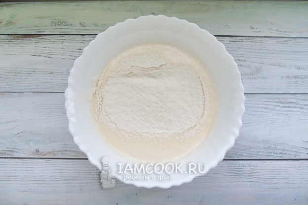 Постепенно добавьте просеянную муку. Перемешайте тесто.
