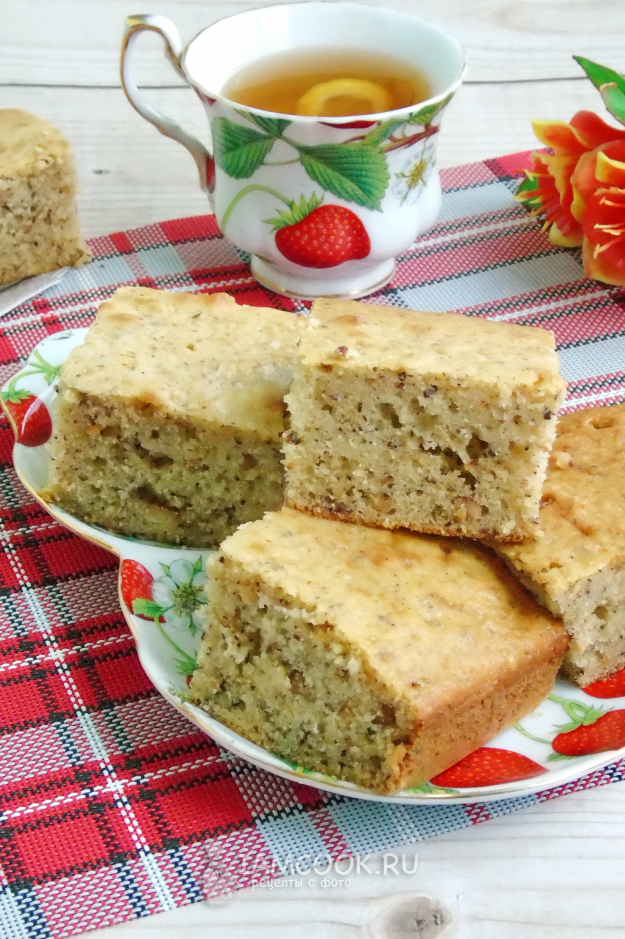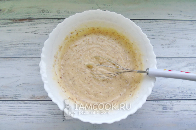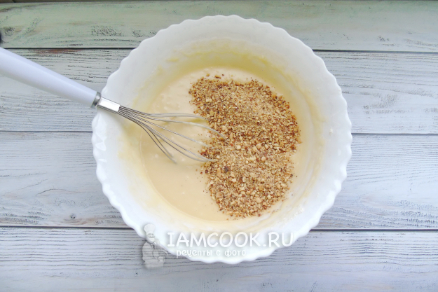 Перемешайте тесто с орехами. Оно по консистенции должно быть не густым и не жидким. Тесто сразу растекается и не держит форму.