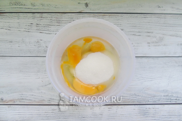 Яйца разбейте в миску и добавьте сахар.