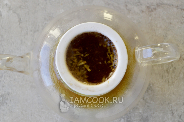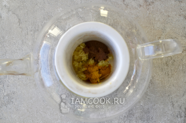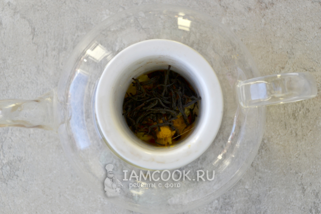Заварочный чайник ополосните кипятком, положите натертый имбирь, всыпьте корицу и куркуму.
