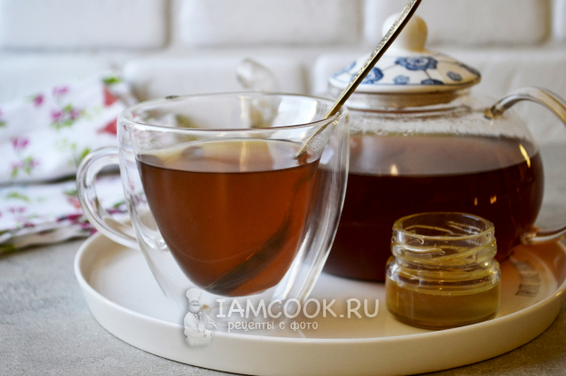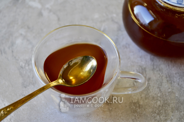 Перед употреблением чай с куркумой, имбирем и корицей необходимо процедить. В кружку с чаем положите ложечку меда, перемешайте.