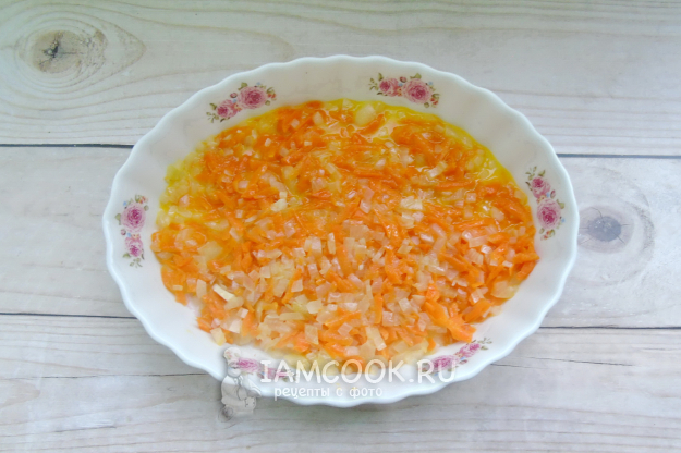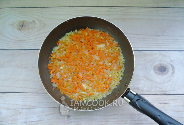 Одну луковицу и морковь очистите и помойте. Морковь натрите на терке, а лук мелко нарежьте. Выложите в сковороду с подсолнечным маслом и пассеруйте до прозрачности лука.