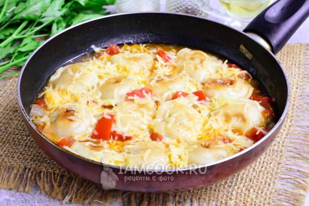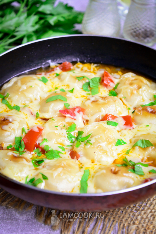 Перед вам все необходимые ингредиенты, чтобы приготовить жареные пельмени с помидорами и сыром на сковороде.