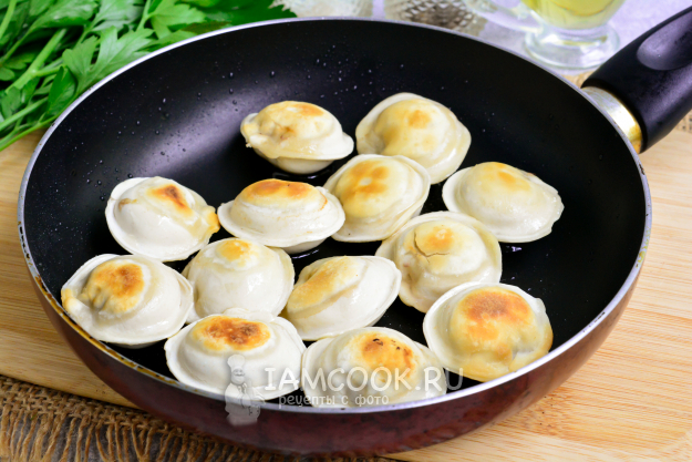 Обжарьте пельмени на смеси сливочного и растительного масел. Обжаривайте 4-5 минут, чтобы пельмени подрумянились.