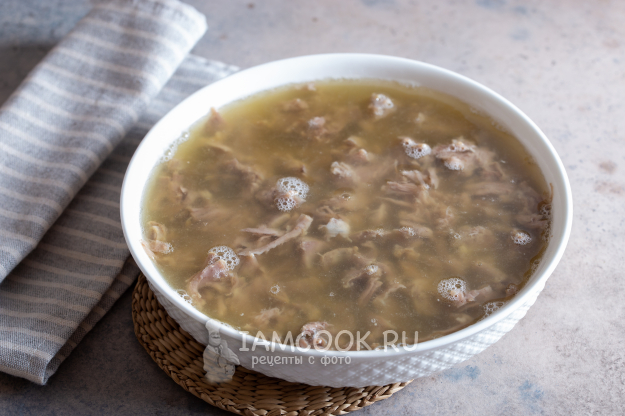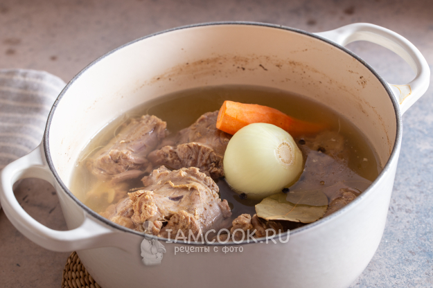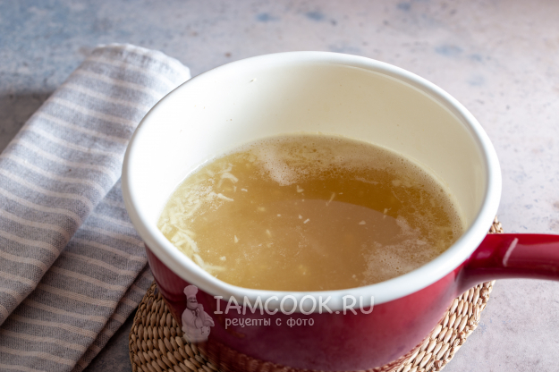 Мясо достаньте из бульона. Бульон перелейте через сито в другую кастрюлю. Бульона должно получиться меньше 500 мл.