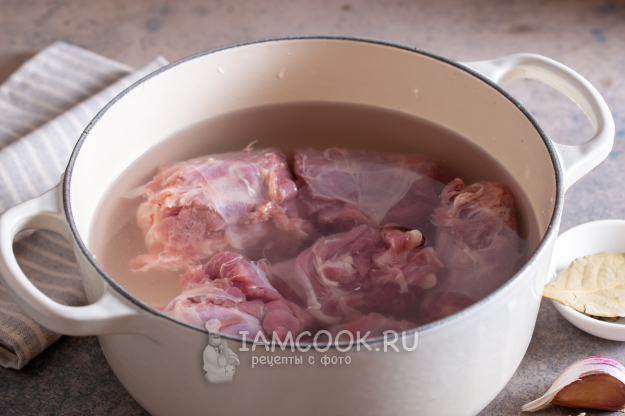 Поставьте кастрюлю на огонь, доведите до кипения, снимите пену. Нагрев убавьте ниже среднего, закройте кастрюлю крышкой и варите шеи 4-5 часов.