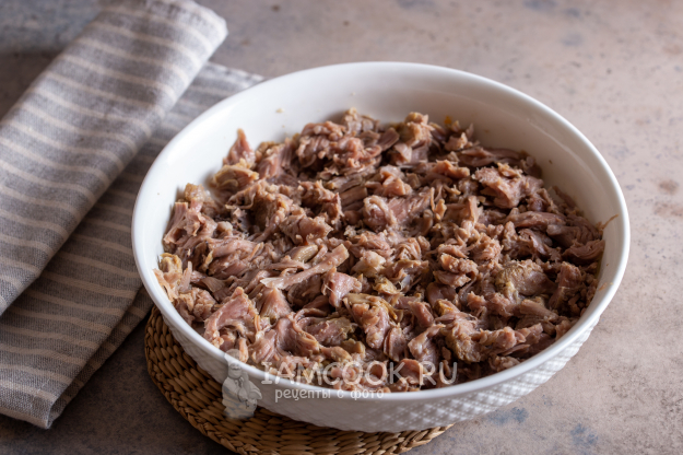 Мясо отделите от костей и разберите на волокна. Выложите мясо в подготовленную посуду для холодца.