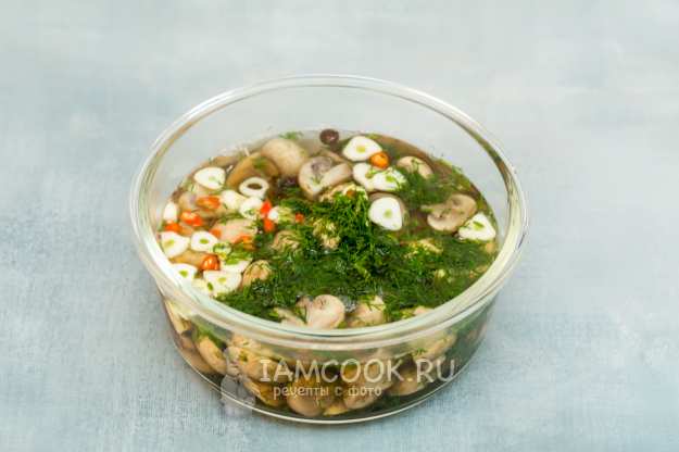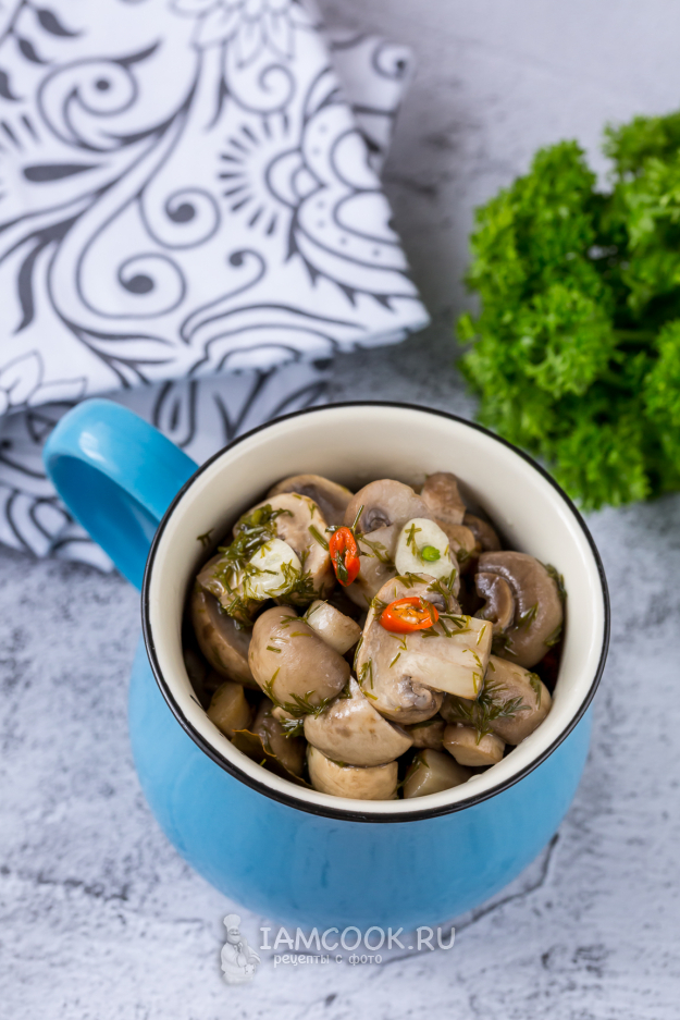 Маринованные шампиньоны с острым перцем и чесноком готовы.