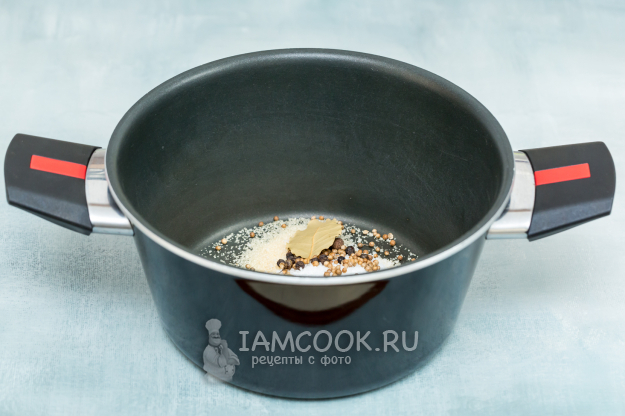 Смешайте соль, сахар, оба вида перца (кроме острого), лавровый лист, кориандр.
