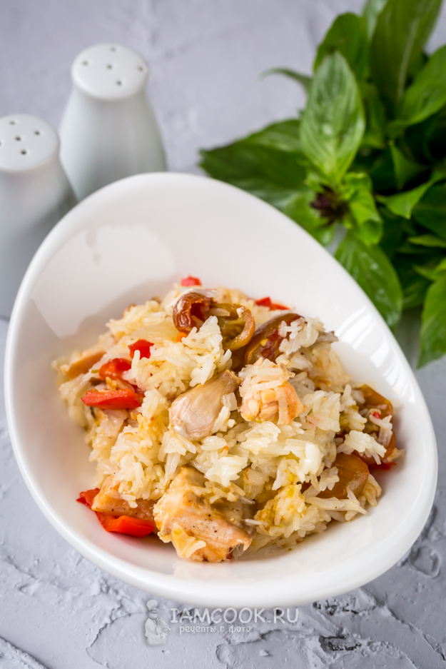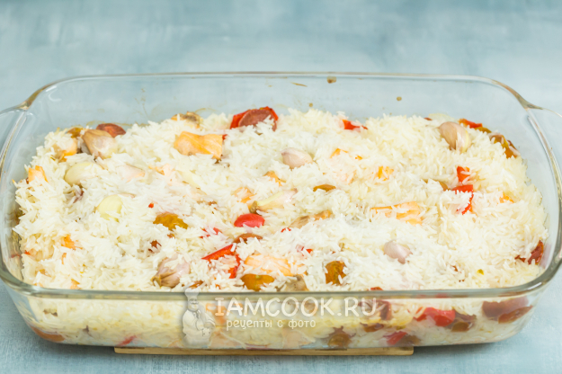В конце приготовления, когда воды почти не осталось, я накрыла форму фольгой, чтобы рис пропарился.