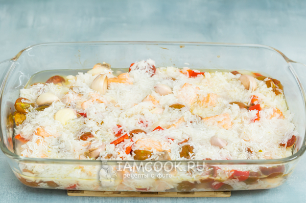 Убавьте температуру до 180 градусов и запекайте семгу с рисом в духовке еще 25-30 минут.