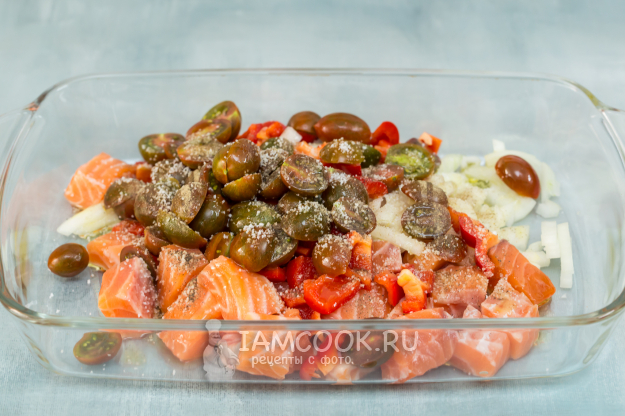 В форме для запекания смешайте нарезанные помидоры, лук, рыбу и болгарский перец.