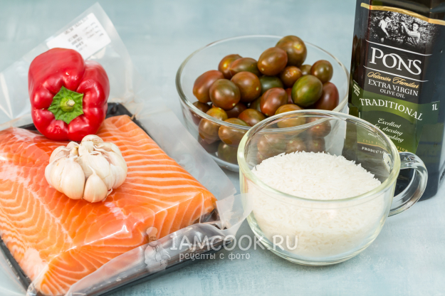 Для приготовления семги с рисом в духовке подготовьте продукты по списку.