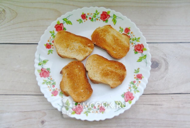 Ломтики багета или батона поджарьте на гриле или сухой сковороде и натрите зубчиком чеснока.