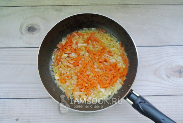 Налейте подсолнечное масло и жарьте овощи до прозрачности лука.