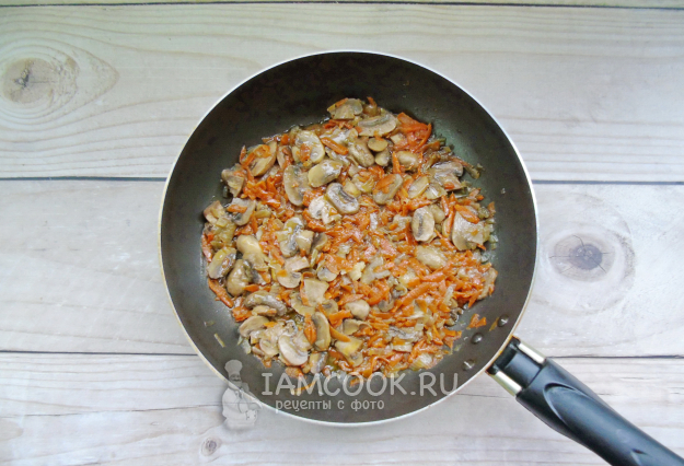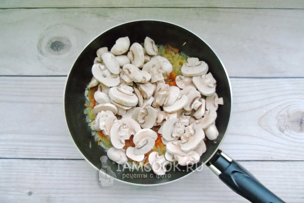 Шампиньоны очистите, помойте и нарежьте. Добавьте в сковороду с луком и морковью.