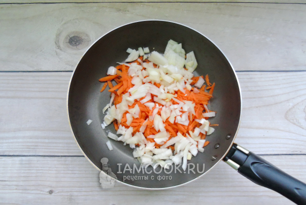 Морковь и репчатый лук очистите, помойте. Морковь натрите на терке, а лук мелко нарежьте. Выложите в сковороду.