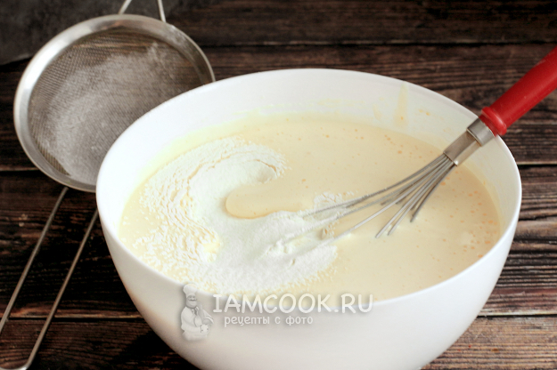 Муку просейте с разрыхлителем и добавьте к яйцам. Начните со 140 граммов. Если получится совсем жидко, добавьте еще 20 г муки.