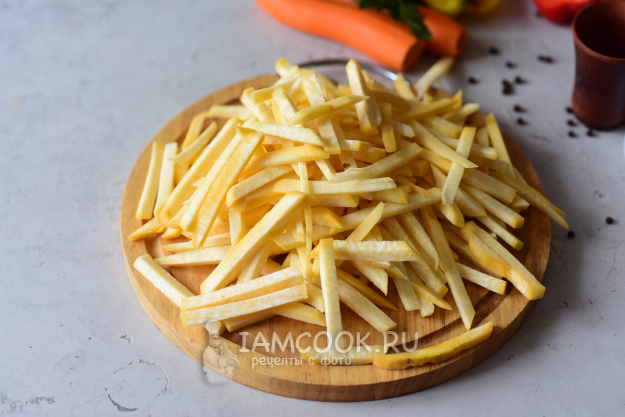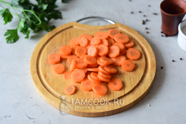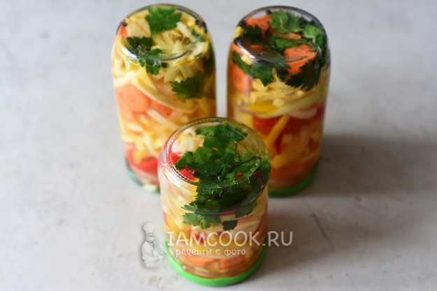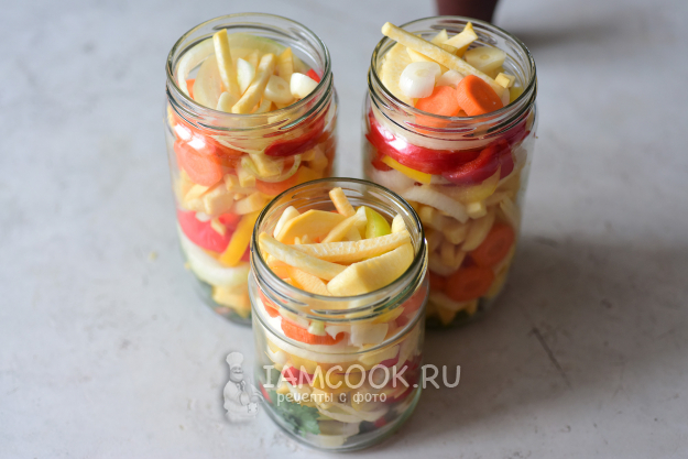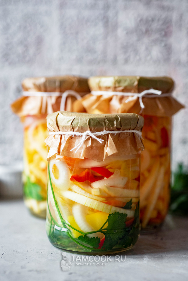 В простерилизованные баночки на дно каждой уложим по веточке петрушки, горошки перца, затем плотно уложим брусочки репы, соломку перца, кольца лука, кружочки моркови, нарезанный чеснок. Все эти ингредиенты стараемся равномерно распределять по стеклянным емкостям.