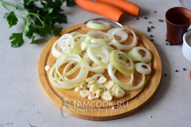 Лук нарежем кольцами, чеснок нашинкуем пластинами.
